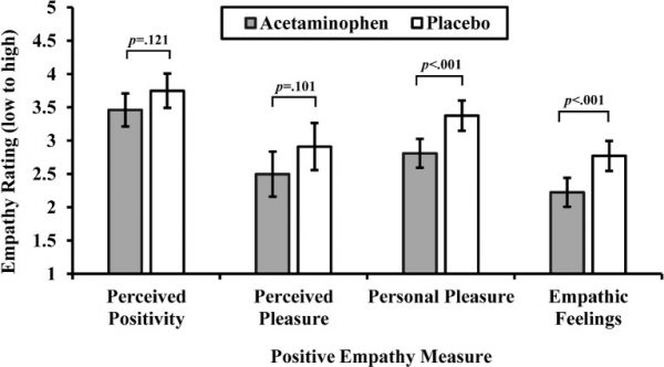 “Results showed that acetaminophen reduced personal pleasure and other-directed empathic feelings in response to these scenarios,” the researchers reported.