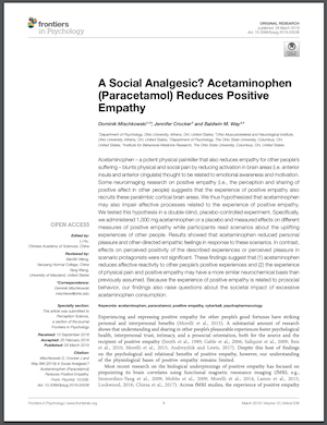“Finally, our findings have important practical implications. Positive empathy provides part of the “social glue” from which interpersonal bonds are built and strengthened (Morelli et al., 2015). As such, taking pleasure from the good fortune of others fosters interpersonal connection, trust, and—ultimately—prosocial behavior (Reis et al., 2010; Morelli et al., 2014; Andreychik and Migliaccio, 2015), thus providing important societal benefits. These benefits have to be viewed in the context of the number of people regularly consuming acetaminophen. An estimated quarter of all US American adults take a drug containing acetaminophen every week (Kaufman et al., 2002). It is thus possible that the pervasive use of acetaminophen among Americans may substantially reduce these benefits. However, there is currently no research on the relationship between acetaminophen usage and reduced prosocial behavior in the USA. This research gap needs filling.
