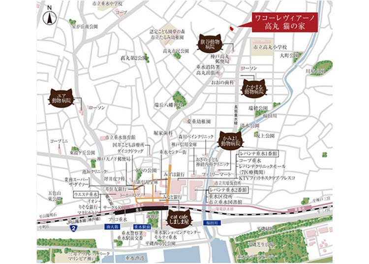 Overlooking the ward of Tarumi, the cat homes are conveniently located within a 15-minute walk of four animal hospitals.