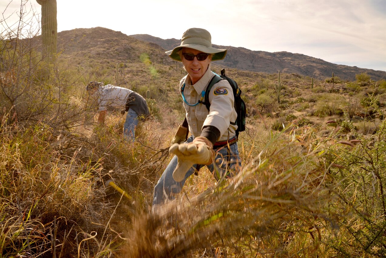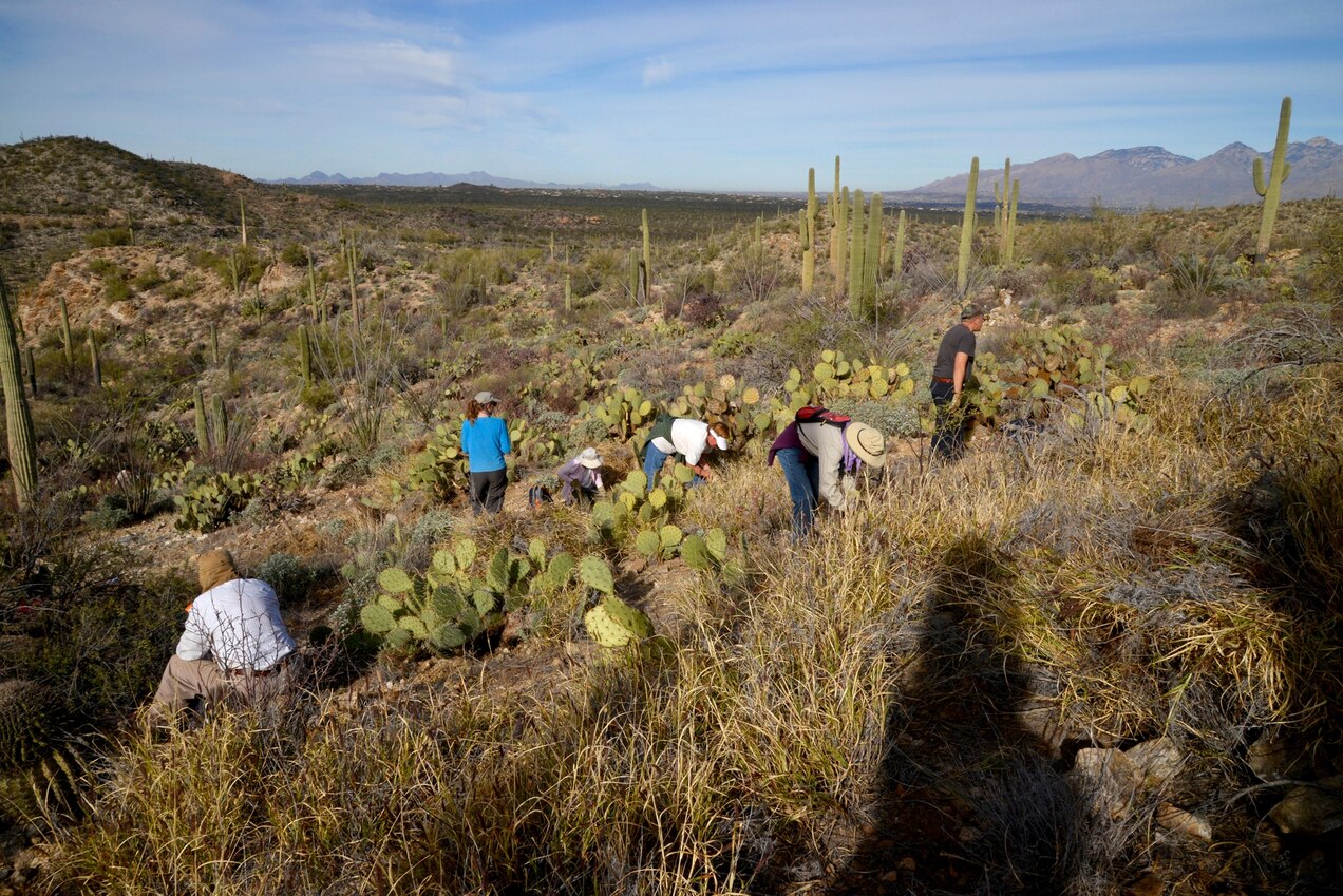 Perry Grissom, the restoration ecologist at Saguaro National Park, says that people, like himself, who study invasive species can “see a train wreck before it’s happened, so the hard part is getting other people to see that train wreck.” Luckily, volunteers from the region have stepped up to help. (Visitors are also allowed to sign up for buffelgrass pulls.)
