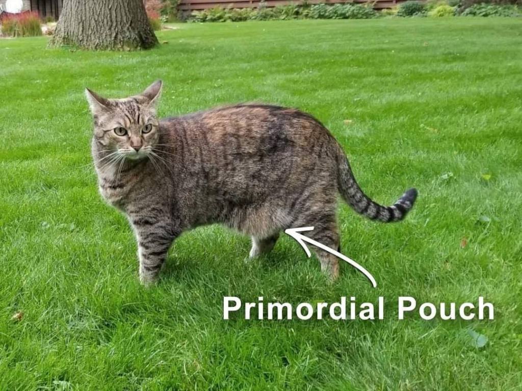 That bit of skin, fur and fat is a protective layer called the primordial pouch. It’s positioned along the length of a cat’s belly. These pouches are perfectly normal and healthy, said José Arce, president-elect of the American Veterinary Medical Association. All cats have primordial pouches, but they vary greatly in size; some are almost undetectable. It’s easiest to see a small pouch when it flops back and forth as a cat runs.